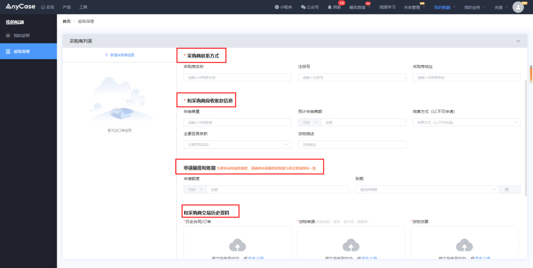 填寫采購商聯(lián)系方式、應(yīng)收賬款信息、申請額度和賬期,上傳相關(guān)資料點(diǎn)擊提交;