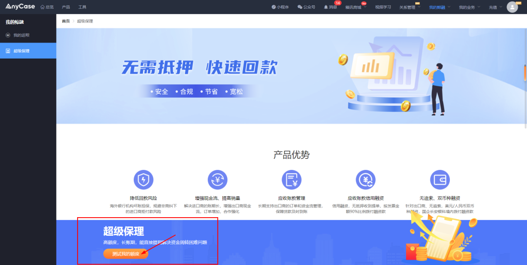 進(jìn)入超級保理頁面,點(diǎn)擊左下方測試我的額度;