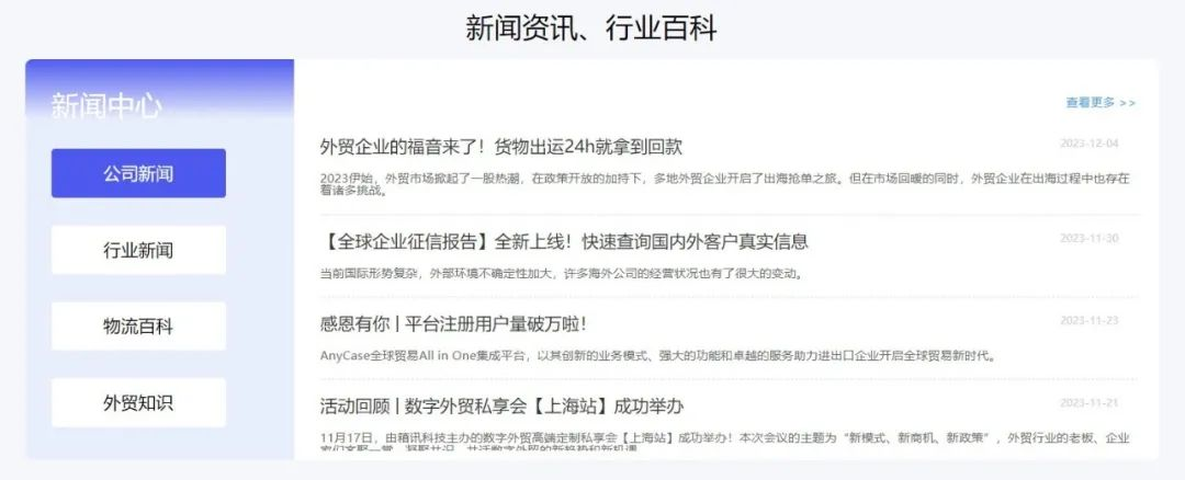 該版塊囊括了新聞資訊以及行業百科。每日發布全球最新外貿資訊、時事熱點,讓用戶實時掌握貿易信息,挖掘商機。以及箱訊最新公司新聞,產品動態更新,外貿業務物流干貨知識全覆蓋。
