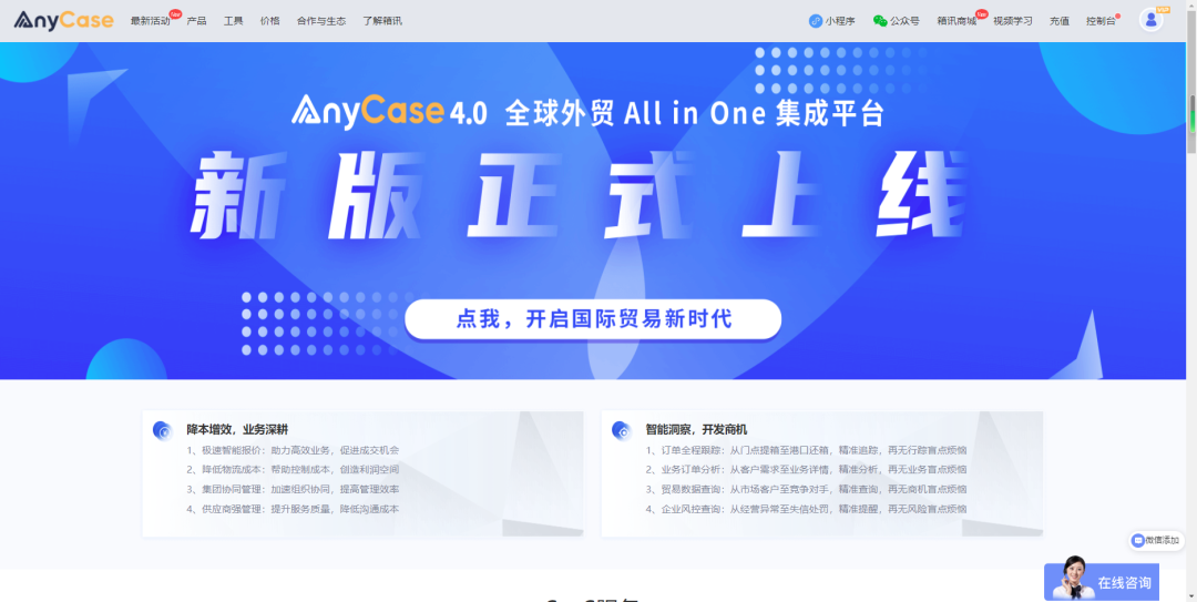 箱訊AnyCase平臺精心打磨的全球外貿供應鏈SaaS系統自上線以來,受到廣大客戶的歡迎和好評,幫助外貿企業快速實現數字化轉型,從獲客、風控、物流、回款等各環節助力降本增效。
