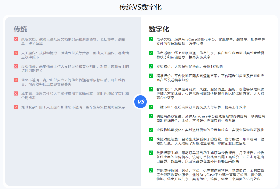 AnyCase平臺從詢價、下單、訂單履約至財務對賬結算,一站式智能化完成整個業務閉環。全新的詢價模式,完善的供應商管理,智能精細化的訂單履約等方式全面幫助客戶降本增效。