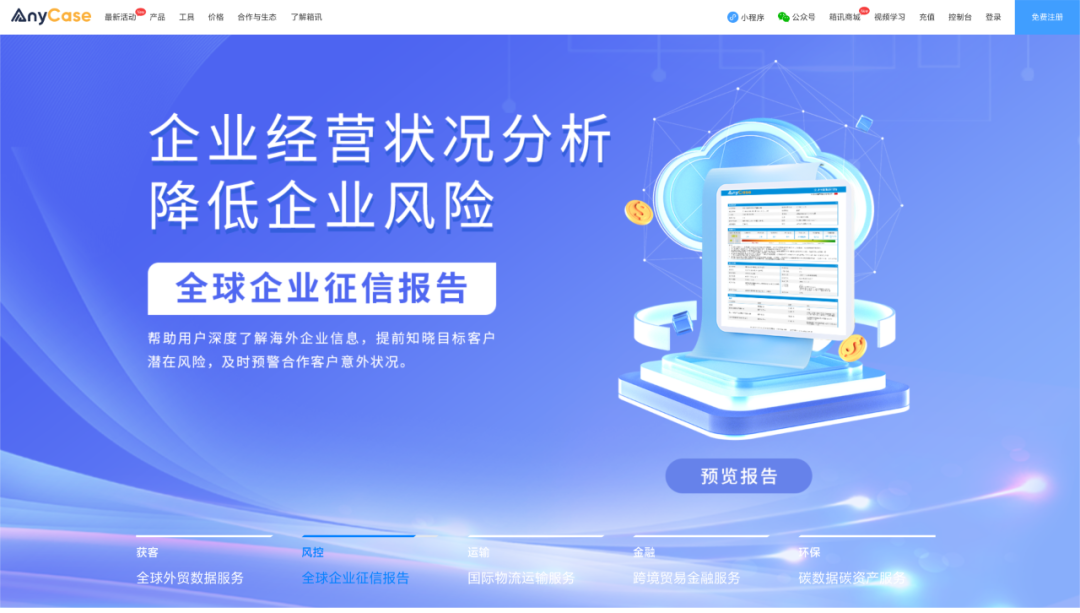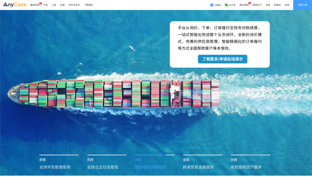 箱訊科技一直以來深耕國際貿易領域,以科技驅動創新,致力打造數智化貿易生態圈。箱訊AnyCase平臺從獲客、風控、運輸、金融、環保等方面,為中國進出口企業提供一站式跨境貿易供應鏈全生命周期解決方案。讓跨境貿易更便捷、更安全、更高效。